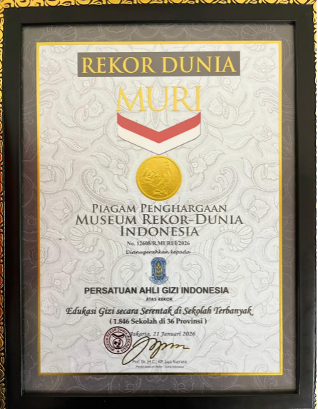 Yogyakarta, 21 Januari 2026 — Dalam rangka memperingati Hari Gizi Nasional (HGN) ke-66, Persatuan Ahli Gizi Indonesia (PERSAGI) berhasil mencatatkan prestasi nasional dengan meraih Rekor Museum Rekor-Dunia Indonesia (MURI) atas penyelenggaraan “Edukasi Gizi Serentak di Sekolah”.