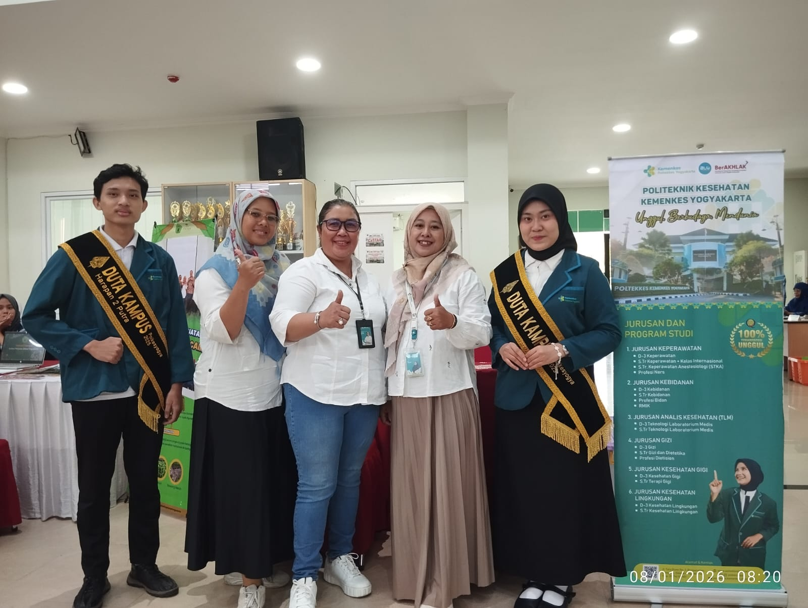 Tim promosi Poltekkes Kemenkes Yogyakarta yang bertugas terdiri dari Dra. Rita Rena Pudyastuti, M.Kes, Sri Haryanti, SST., M.Si, Vitria Dwi Wulansari, S.SiT, MPH, Dietisien, Dua orang Mahasiswa Duta Kampus PolkesYo.